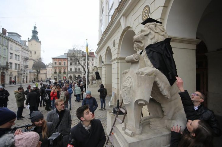 Сьогодні, 17 листопада, з нагоди Міжнародного дня студента львівських левів на площі Ринок, а також найбільшого лева міста, який був встановлений до сторіччя ЗУНР, одягнули у студентські мантії.