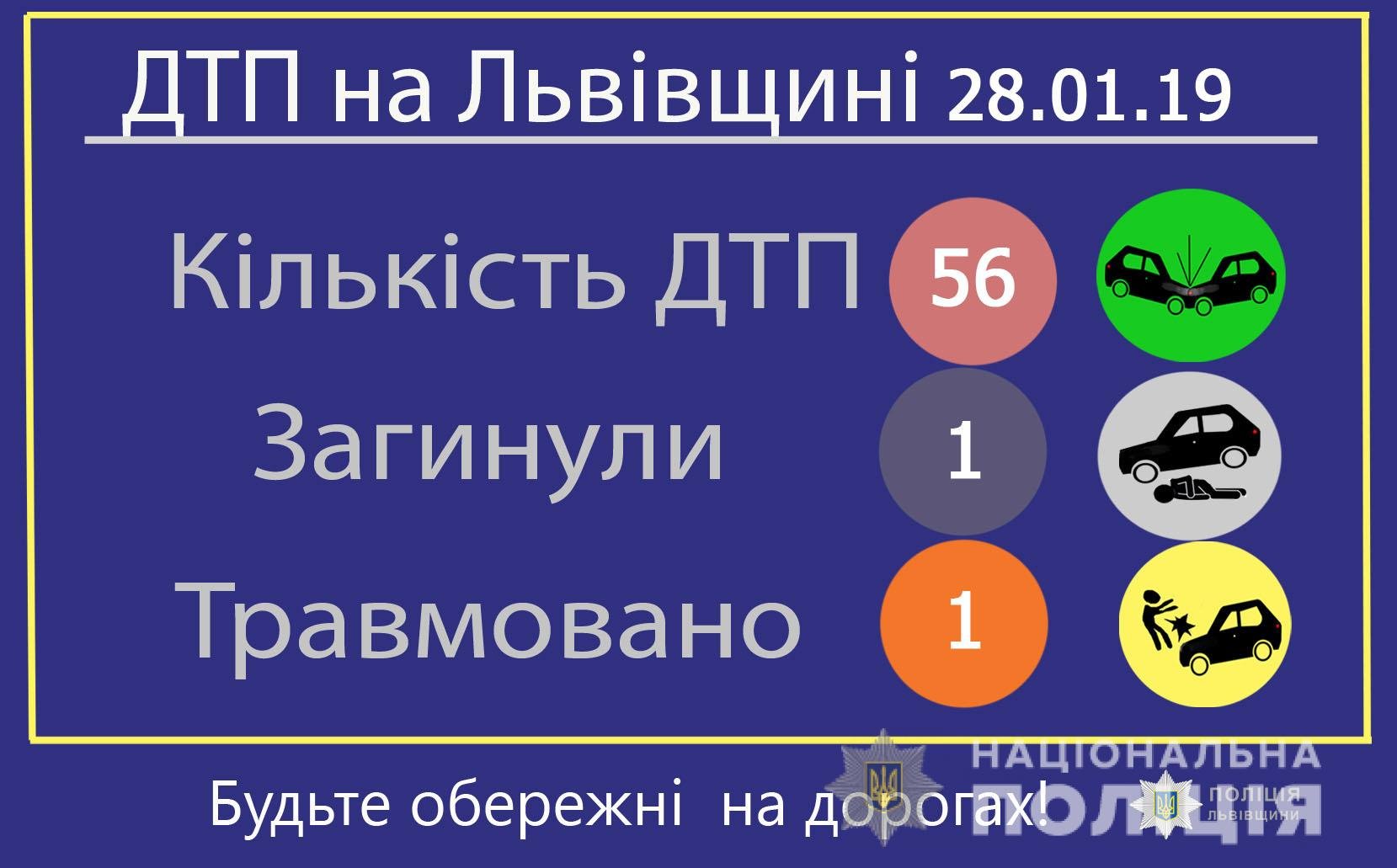 Як інформує прес-служба поліції Львівської області, 18 автопригод стались на дорогах області, ще 38 — у Львові. Внаслідок ДТП одна особа загинула, ще одна — травмована.