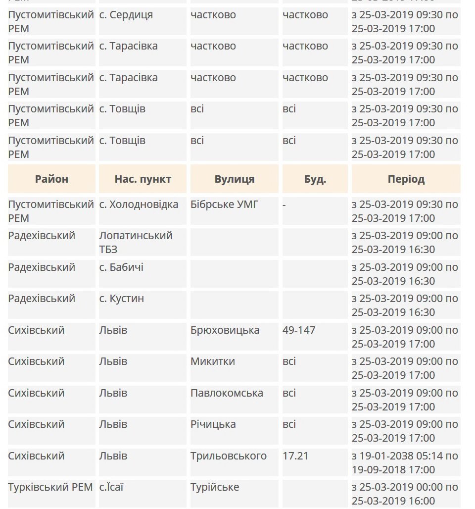 Про це повідомили в ПАТ «Львівобленерго».Зокрема, електрика зникатиме у таких районах області: Бродівський, Буський, Дрогобицький, Жидачівській, Золочівський, Пустомитівський, Радехівський, Турківський.