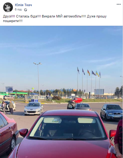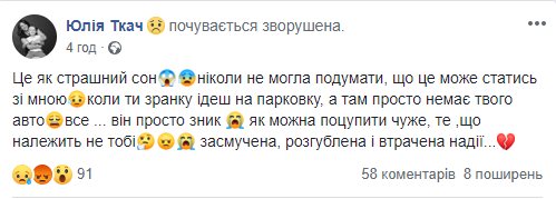 «Це як страшний сон... ніколи не могла подумати, що це може статися зі мною... Коли ти зранку ідеш на парковку, а там просто немає твого авто», — написала Ткач у Facebook.