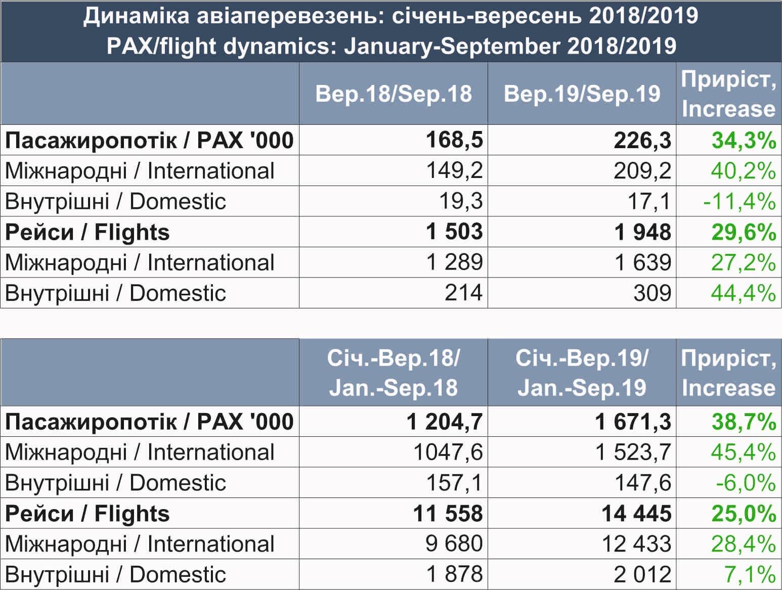«Загалом, у січні-вересні 2019 р. пасажиропотік зріс на 38,7% в порівнянні з показником аналогічного періоду минулого року (1 204,7 тис. пасажирів) і досяг позначки в 1 671,3 тис. пасажирів. Кількість рейсів зросла на 25,0%, з 11 558 до 14 445», – йдеться у повідомленні.