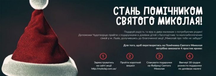 «Запрошуємо усіх людей відвідати Фабрику Святого Миколая, долучитися до акції «Миколай про тебе не забуде» та допомогти Чудотворцю принести радість, щастя та усмішки тим, хто цього справді потребує. Фабрика радо прийме іграшки, солодощі, канцелярське приладдя, дитячі книжки та засоби гігієни. Подарунки просимо приносити до 16 грудня на Фабрику Святого Миколая, яка працюватиме в приміщенні Львівського Палацу Мистецтв за адресою вул. Коперника 17 (з 10.00 до 22.00). Також запрошуємо долучитися до акції водіїв-помічників Св. Миколая, котрі мають змогу допомогти нам з перевезенням волонтерів та подарунків ввечері 18 грудня від Фабрики Святого Миколая до домівок дітей, які з нетерпінням чекають візиту від Помічників Чудотворця.