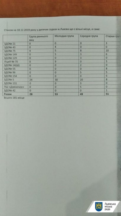 Відтак, у групах раннього віку є 28 вільних місць, у молодших — 53, у середніх — 49, в старших — 51.