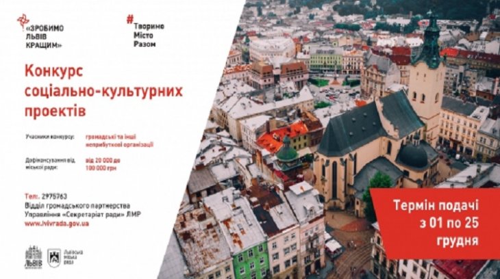 Львівська міська рада оголосила про прийом документів на участь у конкурсі соціально-культурних проектів «Зробимо Львів кращим!» на 2020 рік. Прийом проектів на участь у конкурсі триває до 25 грудня 2019 року (включно).