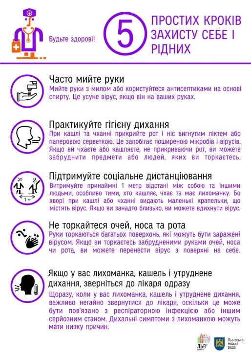 Нагадаємо, щоб не захворіти на гостре респіраторне захворювання, потрібно часто мити руки, дотримуватися кашльового етикету, їсти повноцінну здорову їжу, зберігати ноги у теплі, застосовувати дезинфікуючі засоби тощо. Всі ці принципи неспецифічної профілактики, як і від будь-якого гострого респіраторного захворювання, є ефективними для унеможливлення поширення коронавірусу.