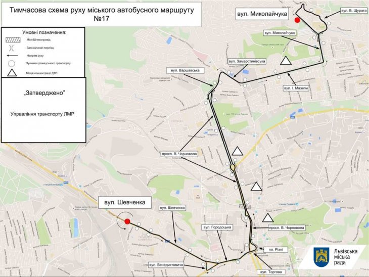 Відзавтра, 14 березня, перекривають ділянку вул. Шевченка, і від завтра маршрут №17 курсуватиме з вул. Щурата, через вул. Городоцьку, тоді по вул. Шевченка, до перекриття — це до повороту на вул. Залізничну, і у зворотному напрямку", — повідомив Орест Олеськів, начальник управління транспорту ЛМР.