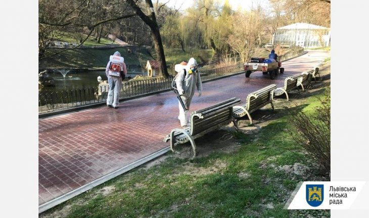 «Сьогодні роботи щодо дезінфікації від коронавірусу другий день поспіль проводили у Стрийському парку. Спеціальними розчинами мили алеї та лавки. Учора тут комунальники продезінфікували смітники, дитячі майданчики та біотуалети. Усі роботи — у спеціальному обладнанні та захисному одязі», — зазначили у ЛКП «Зелений Львів».