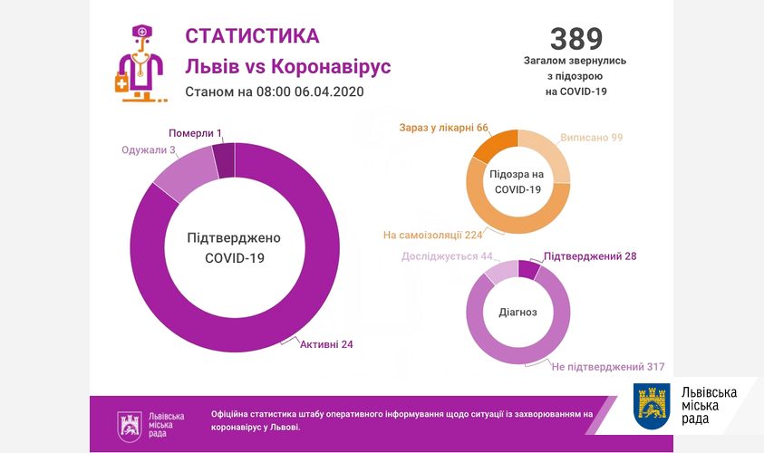 «Станом на сьогодні в нашій лікарні інфекційній 66 хворих, з них 5 знаходяться в реанімації, стан важкий і двоє з них на апаратах ШВЛ. Це власне ті двоє, які мають коронавірус. Загалом ми маєм сьогодні по місту і області 28 людей, де підтверджений діагноз, з яких троє уже вилікувались і одна людина, ви знаєте, померла. І це така велика втрата для нашого міста», — повідомив під час ранкового ефіру на радіо «Львівська Хвиля» мер Львова Андрій Садовий.