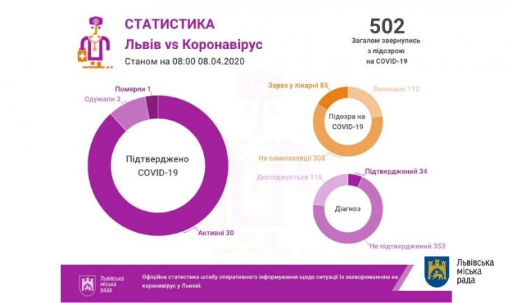 Загалом за весь період карантину до Львівської обласної інфекційної лікарні звернулись 502 особи, госпіталізовані — 197, на амбулаторному лікуванні — 305 осіб, виписані — 112 осіб. Зараз у лікарні перебуває 85 осіб, з них в реанімації — 5 осіб, на апаратні ШВЛ — 2 особи. Загалом коронавірусну інфекцію не виявлено у 353 осіб, виявлено — у 33 осіб, одна людина померла.