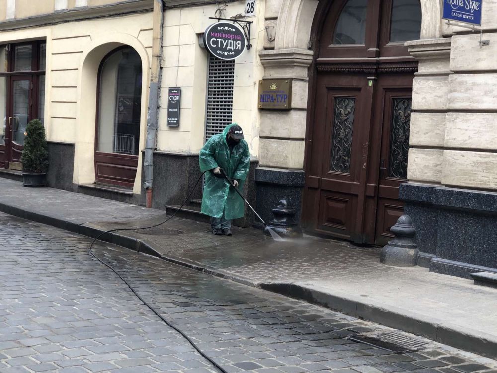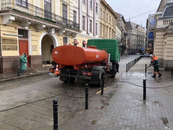 На вулицях Львова продовжують проводити дезінфекцію і миття вулиць, тротуарів, зупинок громадського транспорту, під’їздів житлових будинків. Також проводиться прибирання і очистка територій міста до свят.