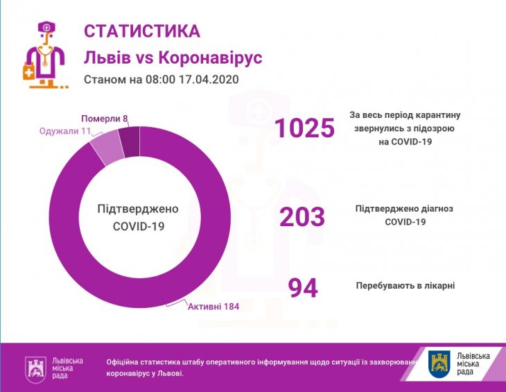 Як повідомила Галина Слічна, заступниця міського голови Львова та керівниця міського штабу з протидії коронавірусу, станом на 08.00 год у Львові та на Львівщині підтверджено 203 випадки інфікування коронавірусом, з них 8 — летальні.