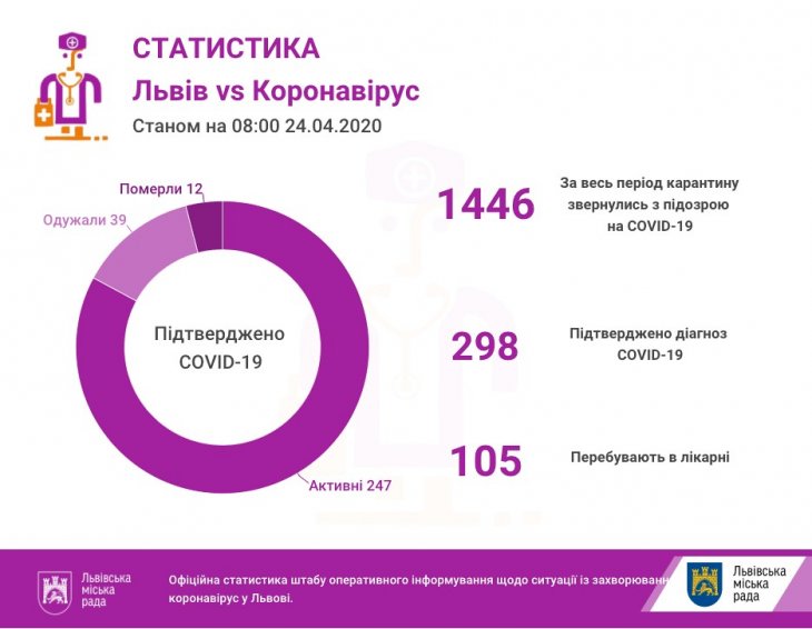 Як повідомила Галина Слічна, заступниця міського голови Львова та керівниця міського штабу з протидії коронавірусу, станом на 08.00 год у Львові та на Львівщині підтверджено 298 випадків інфікування коронавірусом, з них 12 — летальні.