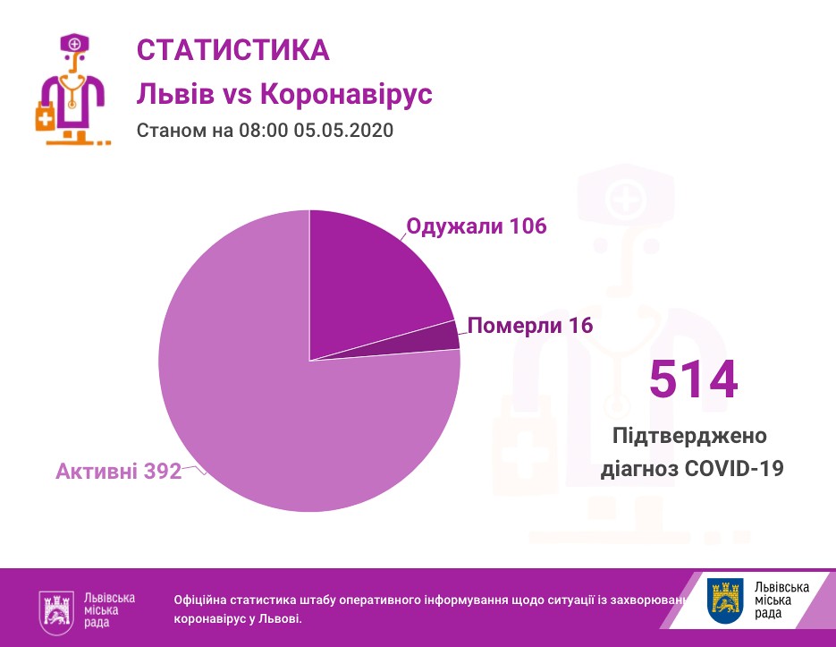 Як повідомила Галина Слічна, заступниця міського голови Львова та керівниця міського штабу з протидії коронавірусу, станом на 08.00 год у Львові та на Львівщині підтверджено 514 випадків інфікування коронавірусом, з них 16 — летальні.