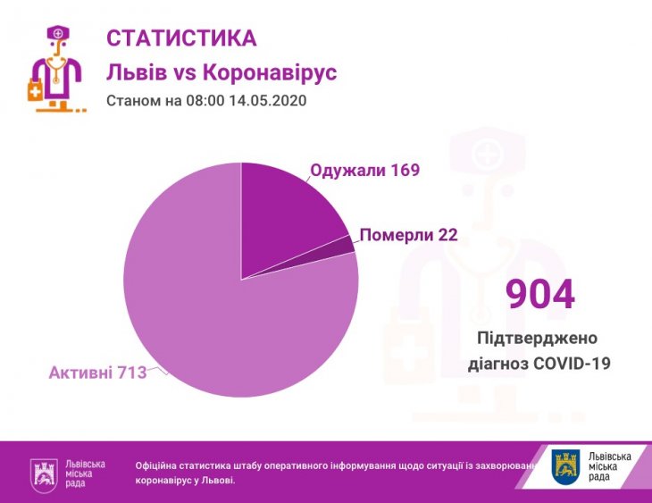 Як повідомила Галина Слічна, заступниця міського голови Львова та керівниця міського штабу з протидії коронавірусу, станом на 08.00 год у Львові та на Львівщині підтверджено 904 випадки інфікування коронавірусом, з них 22 — летальні (наразі статистика ще не врахувала одного пацієнта, який помер також з діагнозом коронавірусу).