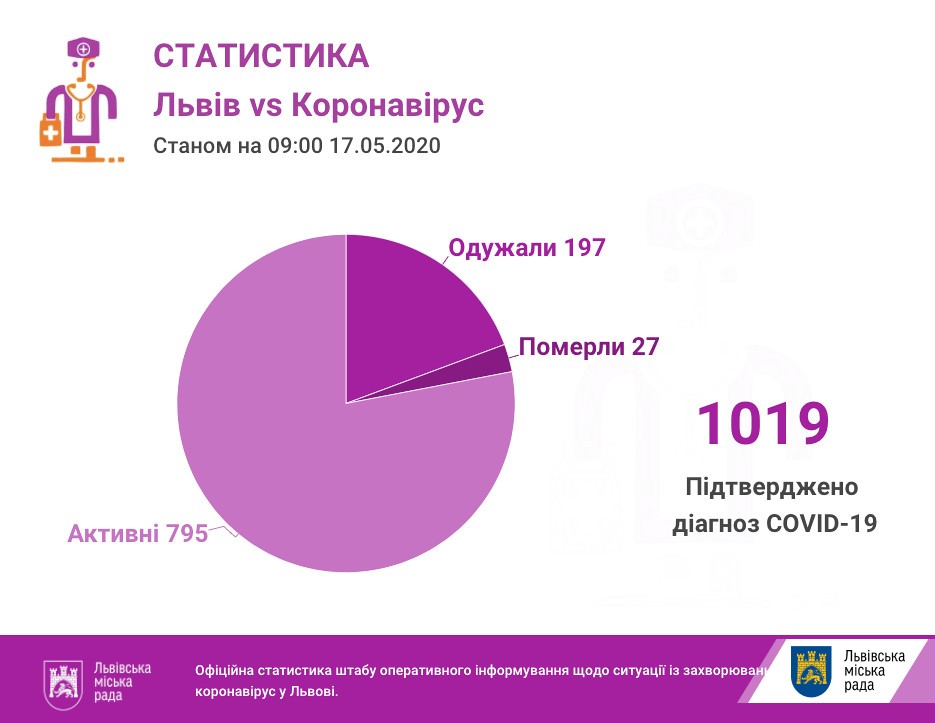 Станом на ранок 17 травня у Львові та на Львівщині 1019 випадків інфікування коронавірусом