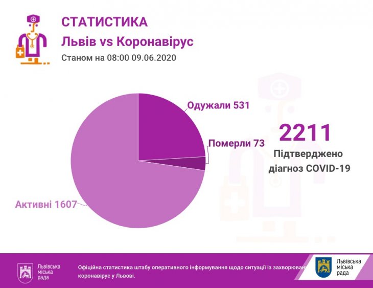 Як повідомила Галина Слічна, заступниця міського голови Львова та керівниця міського штабу з протидії коронавірусу, станом на 08.00 год у Львові та на Львівщині підтверджено 2211 випадків інфікування коронавірусом, з них 73 — летальні.