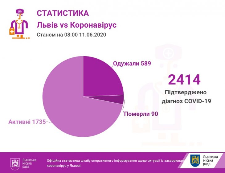 Як повідомила Галина Слічна, заступниця міського голови Львова та керівниця міського штабу з протидії коронавірусу, станом на 08.00 год у Львові та на Львівщині підтверджено 2414 випадків інфікування коронавірусом, з них 90 — летальні.