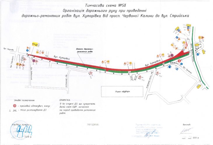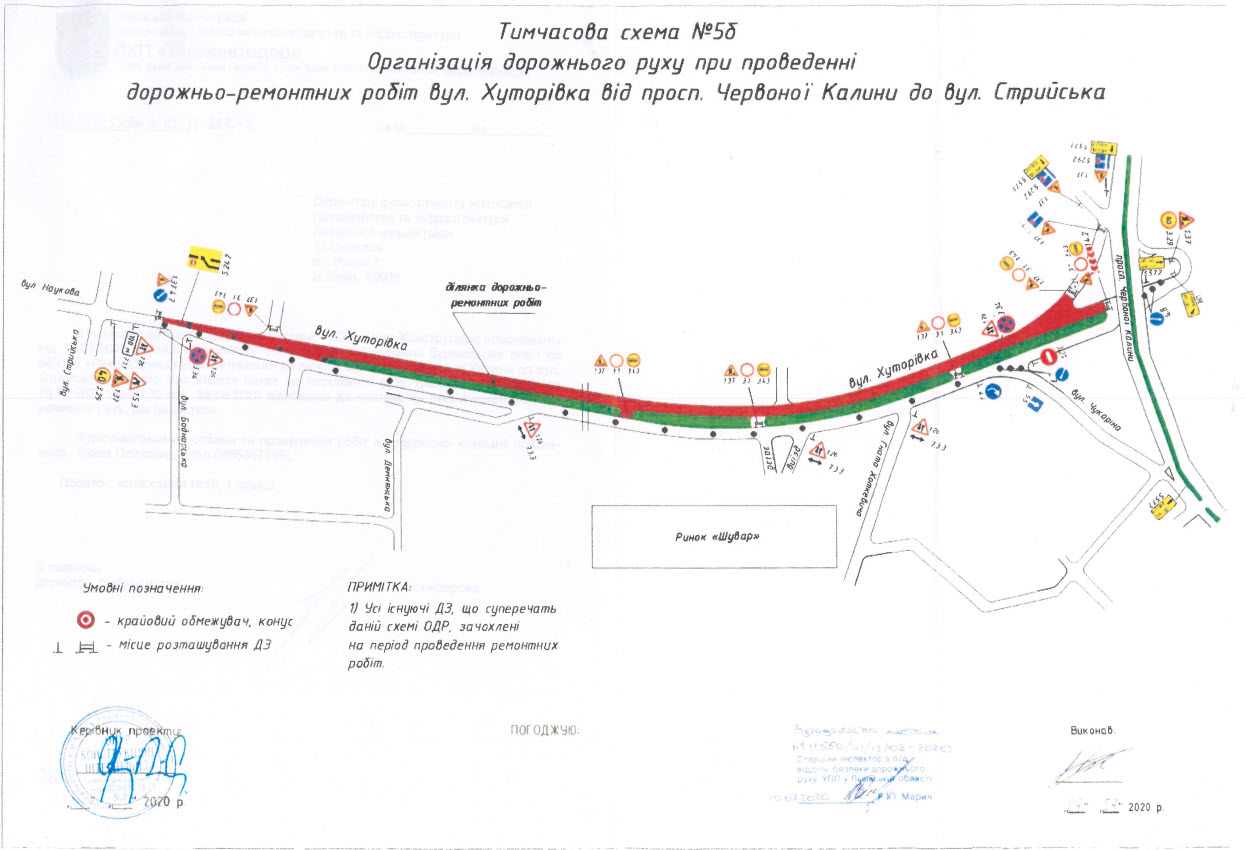 З 8:00 понеділка, 20 липня, буде перекрито для руху транспорту ділянку на вул. Хуторівка від просп. Червоної Калини до вул. Стрийської (непарна сторона). Об'їзд відбуватиметься відповідно до затвердженої схеми.
