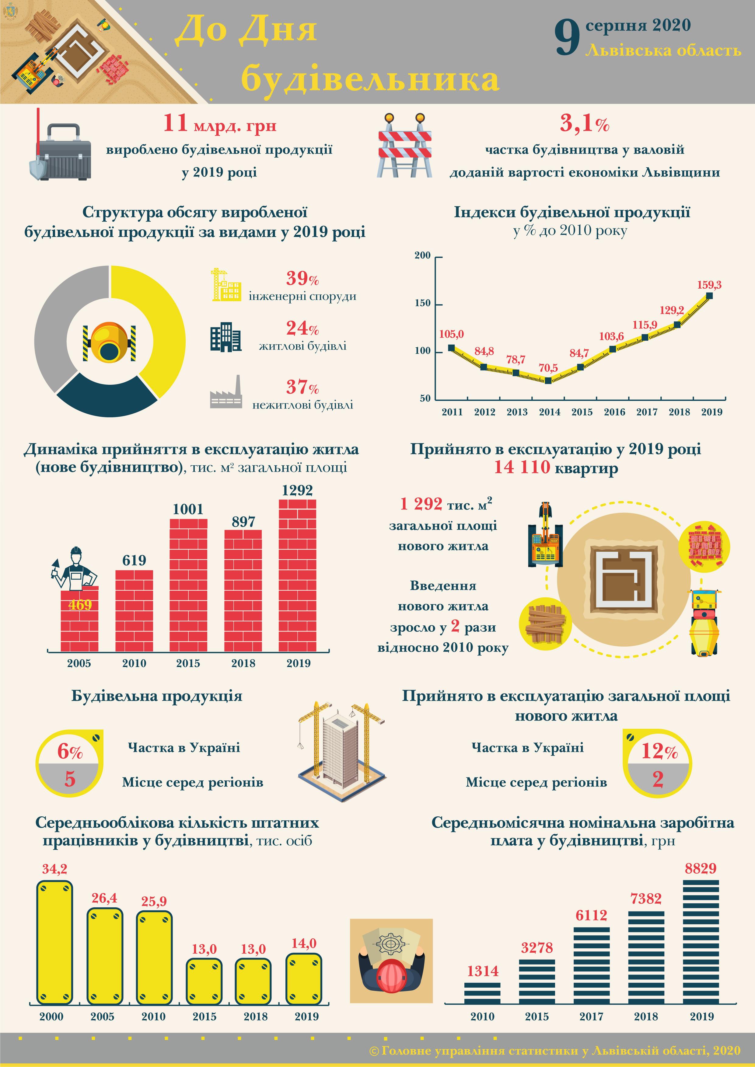 Три роки поспіль в області зростають обсяги введення в експлуатацію житла, а минулого року обсяг прийняття був найбільшим за роки незалежності. У 2019 році прийнято в експлуатацію 1292,2 тис м2 загальної площі нового житла, що на 44% більше коли порівняти з попереднім роком та у 2,1 раза – у порівнянні з 2010 роком. За обсягом прийнятого житла Львівщина посіла 2-е місце серед регіонів України.