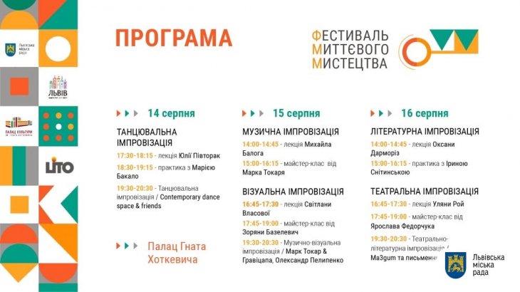 За підтримки управління культури Львівської міської ради у Палаці Гната Хоткевича відбудеться перший офлайн фестиваль миттєвого мистецтва. Щодня протягом трьох днів, з 14 по 16 серпня, на великій сцені Палацу досвідчені митці та мисткині будуть говорити про імпровізацію та практикувати її.