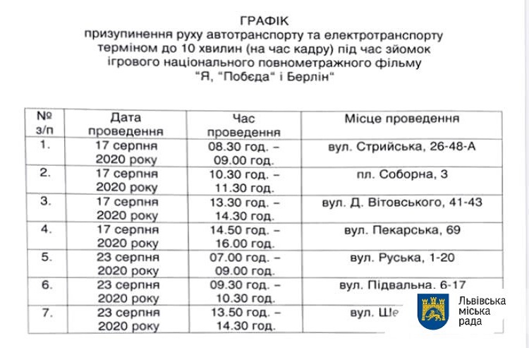 Як повідомили в ЛКП «Львівелектротранс», з 17 до 27 серпня у Львові триватимуть зйомки ігрового національного повнометражного фільму «Я, „Побєда“ і Берлін».