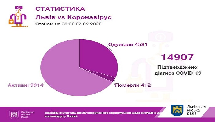 Як повідомила Галина Слічна, заступниця міського голови Львова та керівниця міського штабу з протидії коронавірусу, станом на 08.00 год у Львові та на Львівщині підтверджено 14907 випадків інфікування коронавірусом, з них 412 — летальні. За вчорашню добу лабораторні центри провели 1571 ПЛР-тест. Відтак, 204 — позитивні. Серед них львів`ян — 95.