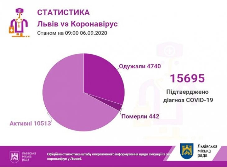 Як повідомила Галина Слічна, заступниця міського голови Львова та керівниця міського штабу з протидії коронавірусу, станом на ранок 6 вересня у Львові та на Львівщині підтверджено 15695 випадків інфікування коронавірусом, з них 442 — летальні. За вчорашню добу лабораторні центри провели 1410 ПЛР-тестів. Відтак, 188 — позитивні. Серед них львів`ян — 71.
