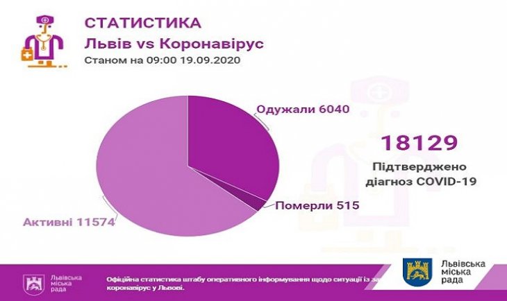 Як повідомила Галина Слічна, заступниця міського голови Львова та керівниця міського штабу з протидії коронавірусу, станом на ранок 19 вересня у Львові та на Львівщині підтверджено 18129 випадків інфікування коронавірусом, з них 515 — летальні. За вчорашню добу лабораторні центри провели 1848 ПЛР-тестів. Відтак, 260 — позитивні. Серед них львів`ян — 101.