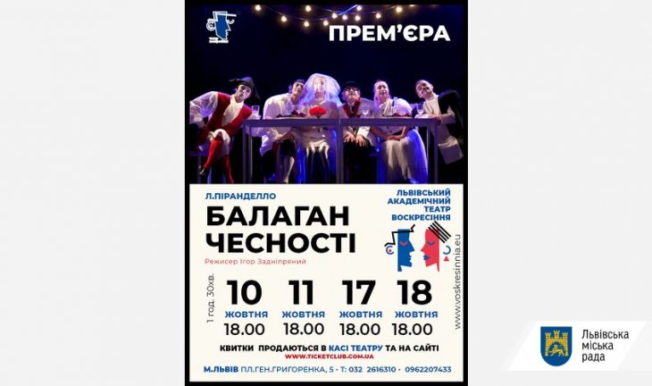 Перш за все відбудеться прем'єра комедії «Балаган чесності» за п'єсою Луїджі Піранделло «Насолода від чесності» — вистава з італійським шармом у стилі комедії дель-арте.