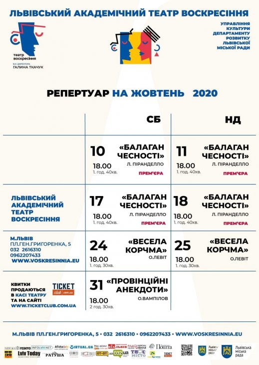 Львівський академічний театр «Воскресіння», окрім організації фестивалю «Золотий Лев на вулиці 2020» (2?4 жовтня), підготував на жовтень цікавий репертуар. Відвідувачів запрошують до театру.