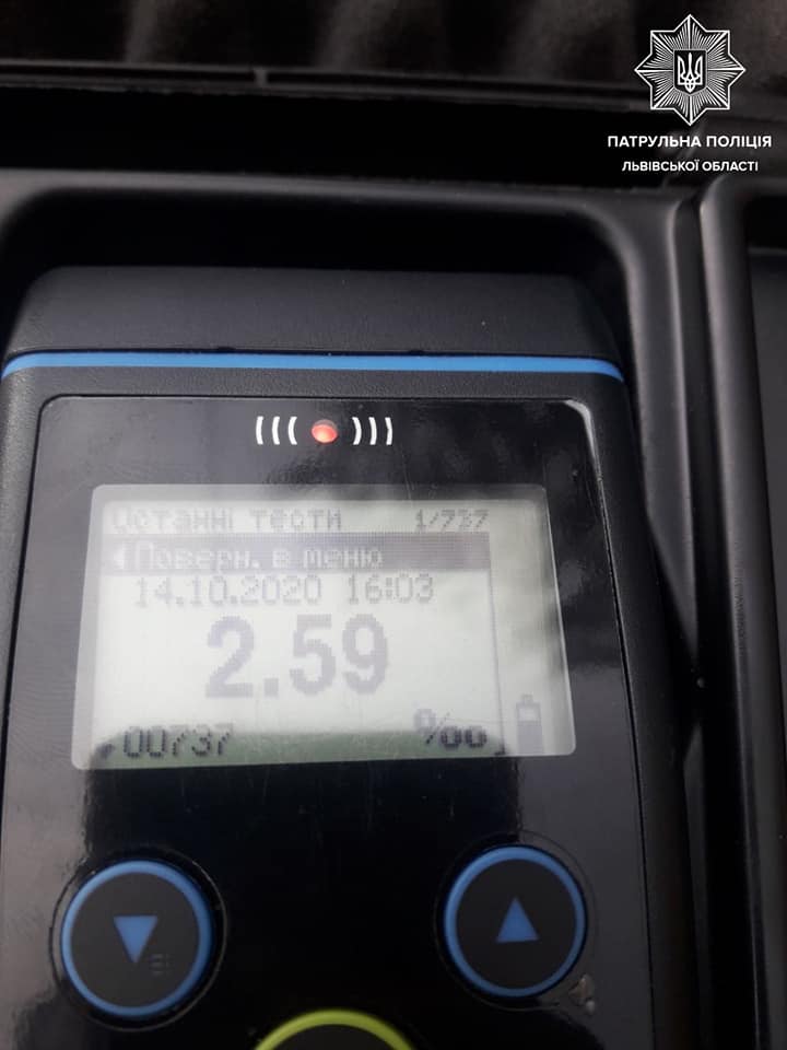 Під час спілкування із винуватцем, патрульні виявили у нього ознаки сильного алкогольного сп'яніння. Львів'янин пройшов перевірку на тверезість. Прилад Drager показав результат 2,59 проміле.