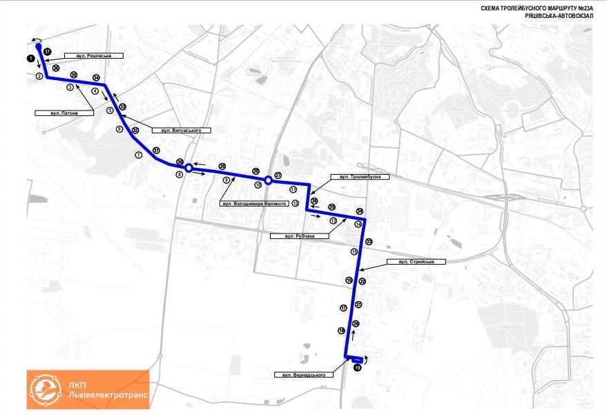 За словами директора ЛКП «Львівелектротранс» Андрія Свищо, тролейбусний маршрут №?23-А курсуватиме за маршрутом: вул. Ряшівська, вул. Патона, вул. Виговського, вул. Володимира Великого, вул. Тролейбусна, вул. Рубчака, вул. Стрийська, вул. Вернадського (Автовокзал) та у зворотному напрямку.