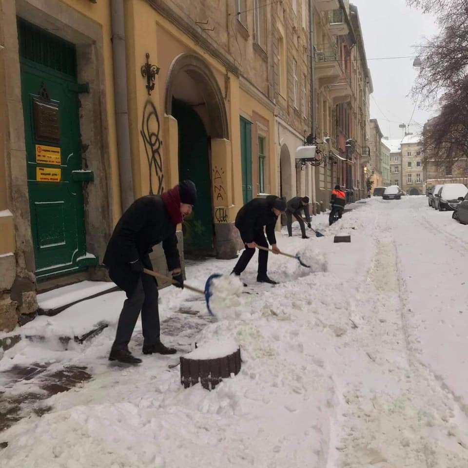 На сторінці Гарячої лінії міста Львова у Facebook опублікували фото, на якому працівники Львівської міської ради разом із заступником мера Андрієм Москаленком вправно орудують лопатами на вулиці.