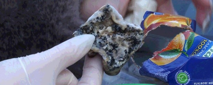 Апельсиновий сік фірми"Sandora", який випила дівчинка, був гіркий, а всередині пакету щось калатало. Коли жінка розрізала пакет, то виявила великий шмат незрозумілої речовини.