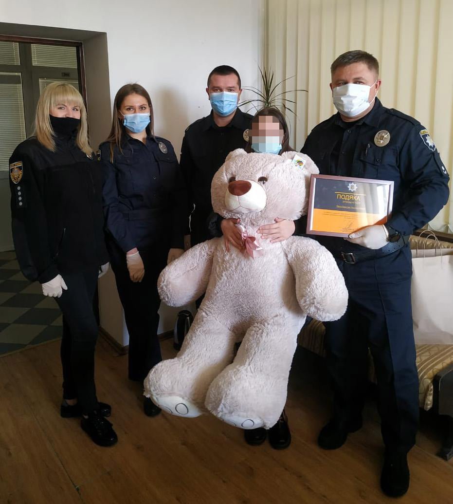 Поліцейські запросили юну героїню до себе, подякували за сміливість, вручили м’яку іграшку подяку