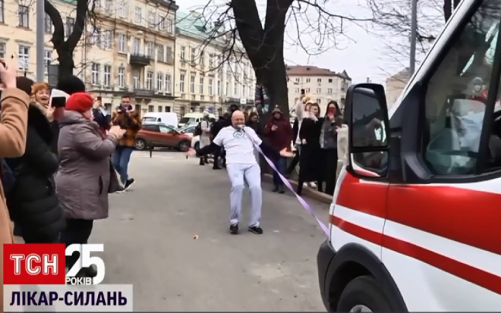 У Львові лікар протягнув зубами швидку, щоб привернути увагу до щеплення проти поліомієліту: відео