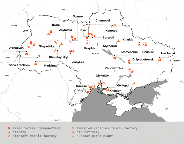На карті біля Львова нанесено знаки Львівського бронетанкового заводу, штабу Збройних сил України та авіаремонтного заводу. А біля Дрогобича вказані позначки нафтопереробного заводу. Ймовірно, це і є першочергові цілі обстрілу.