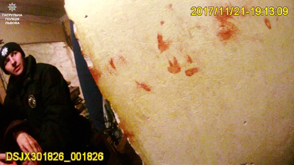 Патрульні відчинили двері і побачили в коридорі блідого та всього в крові чоловіка. Громадянин не розумів, що коїться та не міг сказати ані слова. Один з інспекторів миттєво надів на чоловіка наручники, щоб той не завдав собі та іншим ушкодження. На шиї в особи була глибока рана від порізу, а також розпорена черевна порожнина. Кров практично вже не текла. Слідом за патрульними до квартири зайшли медики, які надали потерпілому медичну допомогу, перев’язали рани та госпіталізували.