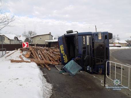 Як попередньо встановили поліцейські, водій автопоїзда «ДАФ 95ХС», 51-річний мешканець міста Житомир, не впорався з керуванням, внаслідок чого вантажівка перекинулася і розсипалася лісопродукція, яку вона перевозила.