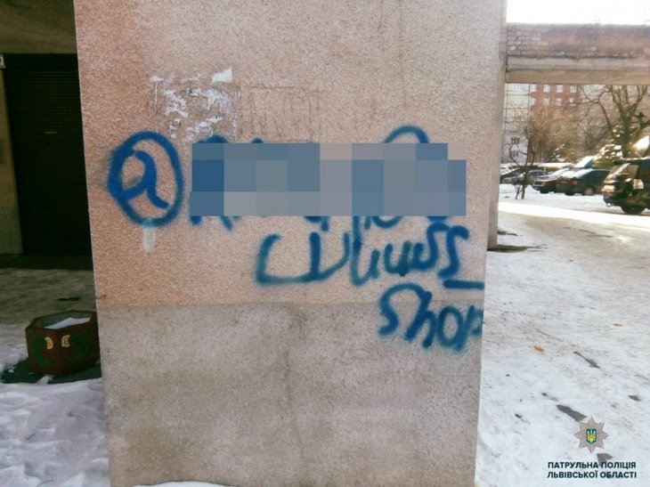 Близько 12.00 год. на вул. Монастирській двоє хлопців з балончиками залишили надпис на фасаді будинку. Це помітив місцевий житель, який і викликав поліцію та надав патрульним опис юнаків.