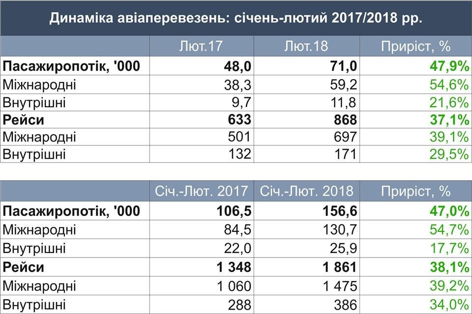 Загалом за січень-лютий 2018 року пасажиропотік зріс на 47% в порівнянні з показником аналогічного періоду минулого року (106,5 тис. пасажирів) і досяг позначки в 156,6 тис. пасажирів. Кількість рейсів зросла на 38,1%, з 1 348 до 1 861.