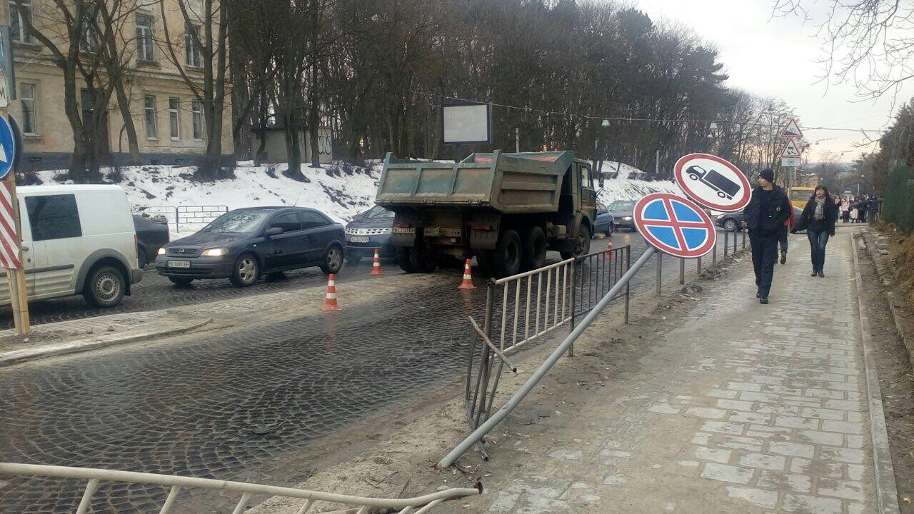 У Львові на Личаківській КамАЗ зніс дорожній знак і паркан біля тротуару