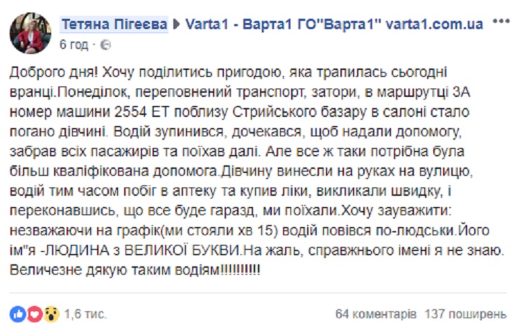 "Хочу поділитись пригодою, яка трапилась сьогодні вранці. Понеділок, переповнений транспорт, затори, в маршрутці №3-А (номер машини 2554 ЕТ) поблизу Стрийського ринку в салоні стало погано дівчині. Її винесли на руках на вулицю, водій автобуса тим часом побіг в аптеку та купив ліки, викликали «швидку», і переконавшись, що все буде гаразд, ми поїхали. Хочу зауважити: незважаючи на графік (ми стояли хвилин 15), водій повівся по-людськи. Його ім’я – Людина з великої букви. На жаль, справжнього імені я не знаю. Величезне дякую таким водіям!", – написала жінка.