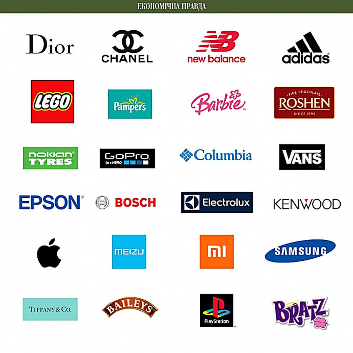До списку торгових марок, які перестане пропускати митниця увійшли: Adidas, Amway, Apple, Canon, Chanel, Chesterfield, Chevrolet, Chivas, Christian Dior, Coca-Cola, Contex, Dormeo, Electrolux, Lego, Levi's, LG, Lipton, Honda, HP, Meizu, Mercedes Benz, New Balance, Nivea, Nokia, Opel, PlayStation, Redmond, Samsung, Sandora, Shell, Subaru, Xerox, Xiaomi та інші. В список заборонених увійшли навіть дочірні підприємcтва Roshen.