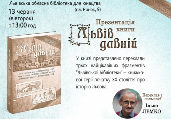 У вівторок, 13 червня, у Львові презентують книгу польської львовознавчої літератури початку 20-го століття "Львів давній" у перекладі Ілька Лемка.