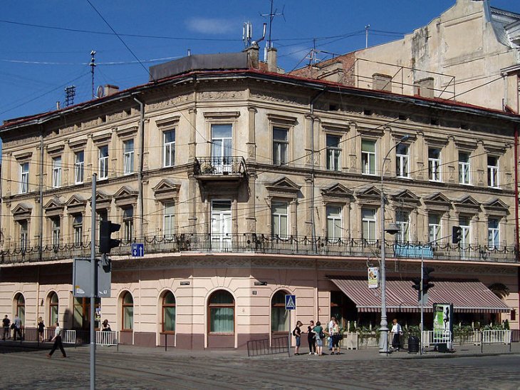 Сам будинок був споруджений 1882 року, за проектом Емануеля Галля. У різний час тут був готель “Центральний” (де тимчасово зупинялася Леся Українка), кав’ярня “Сіті” з довгим балконом вздовж фасаду, радянське кафе “Львів’янка”, а з 1992 року — це частина готельного комплексу “Ґранд-готель”.