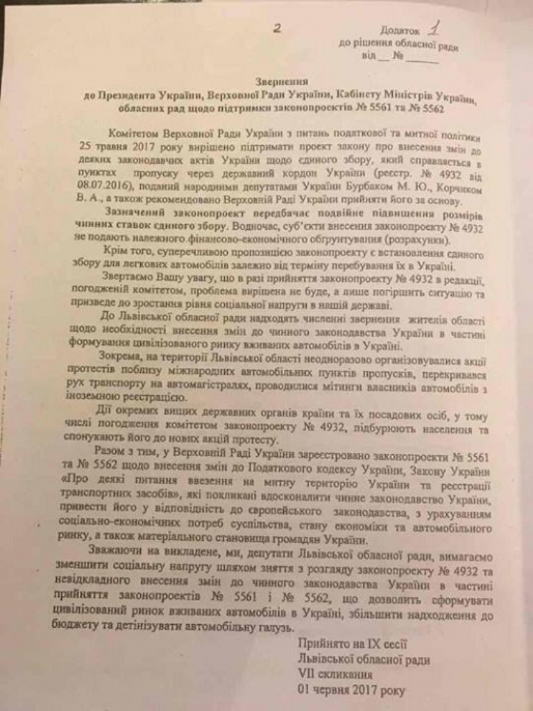 Тому, для зменшення соціальної напругу серед населення, Львівська обласна рада пропонує винести на розгляд Верховної Ради України законопроекти № 5561 і 5562, які покликані вдосконалити чинне законодавство України, привести його у відповідність до європейського законодавства, з урахуванням соціально-економічних потреб суспільства, стану економіки та автомобільного ринку, а також матеріального становища громадян України.