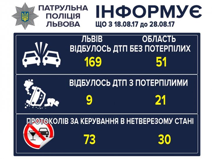Львівські патрульні зареєстрували з 18 до 28 серпня 169 ДТП та оштрафували 73 п’яних водіїв.