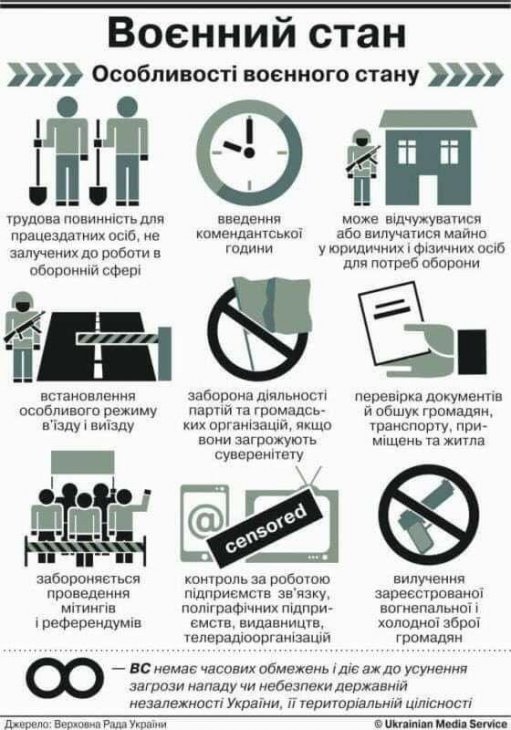 Особливості життя під час воєнного стану доступно пояснює інфографіка від Ukrainian Media Service.