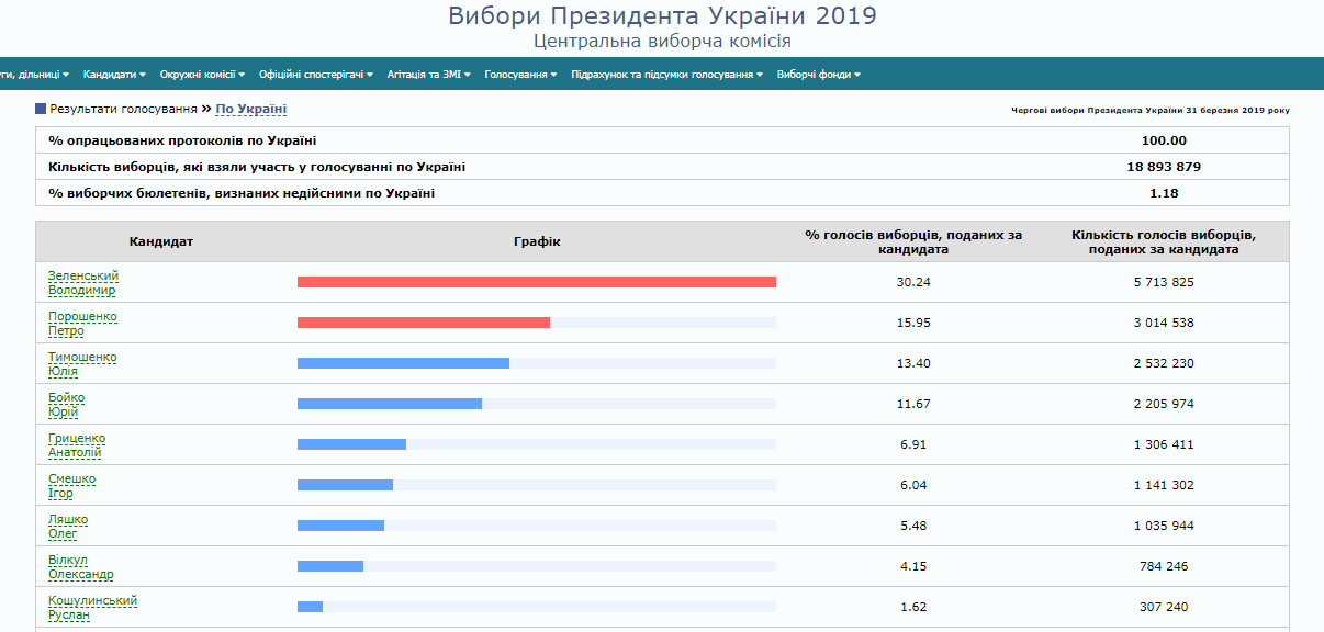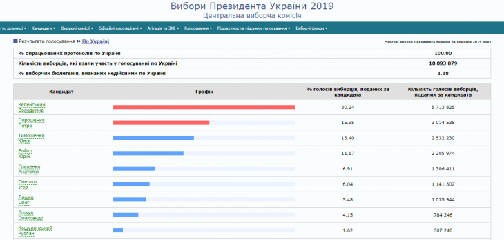 ЦВК порахувала 100% голосів виборців: Зеленський переміг у першому турі
